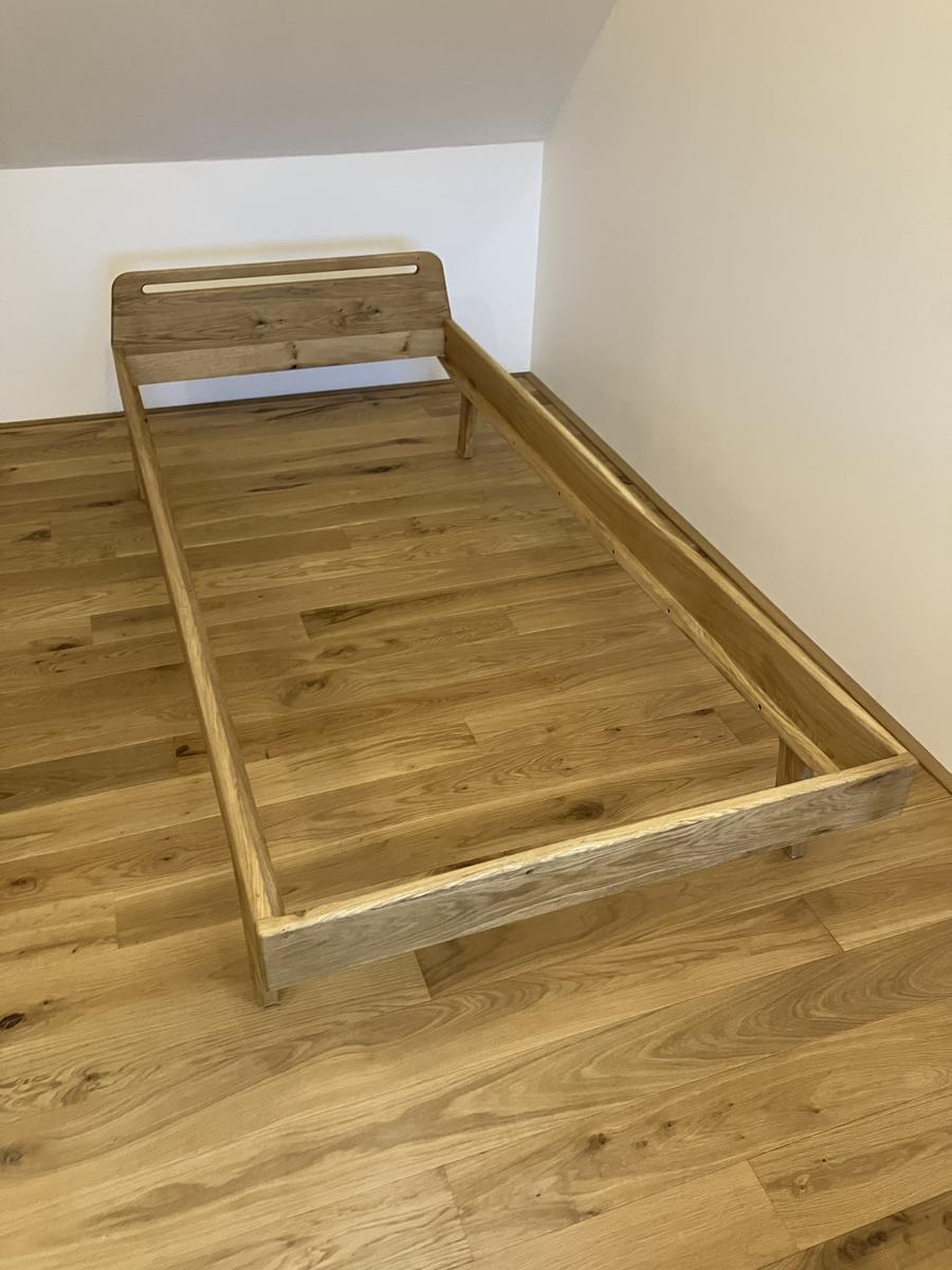 Dubová manželská postel dle vlastního návrhu s levitujícím designem, prohnutým čelem a úložným prost...